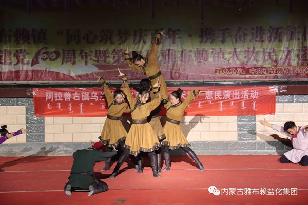 78日晚,阿右旗乌兰牧骑走进雅盐化集团公司,与企业联合举办消夏暨庆祝雅盐建场80周年文艺晚会。